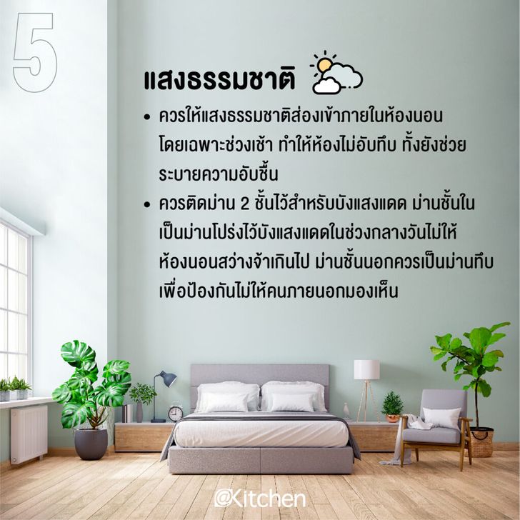 – ควรให้แสงธรรมชาติส่องเข้าภายในห้องนอน โดยเฉพาะช่วงเช้า ทำให้ห้องไม่อับทึบ ทั้งยังช่วยระบายความอับชื้น