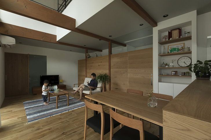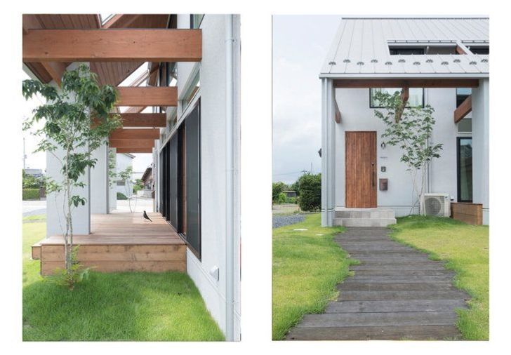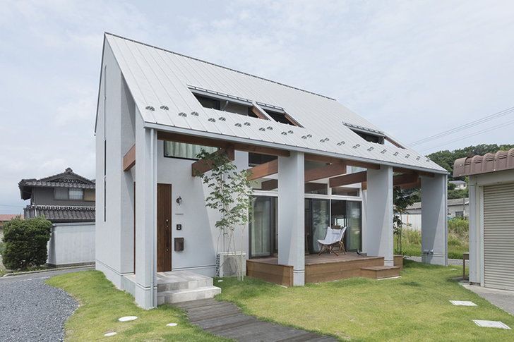 บ้านหลังนี้อยู่ในประเทศญี่ปุ่นตั้งอยู่ท่ามกลางสภาพแวดล้อมที่เต็มไปด้วยบ้านและอาคารบ้านเรือนเก่าหลายๆ หลังก็จริง แต่ไม่ได้รู้สึกแปลกแยกหรือโดดเด่นต่างจากหลังอื่นๆ ออกแบบเป็นบ้านทรงจั่วที่มีความพิเศษตรงที่สถาปนิกได้ขยายชายคาออกมาทางด้านข้าง เพื่อเพิ่มพื้นที่ให้กับสมาชิกในครอบครัวได้มีพื้นที่สำหรับกจิกรรมกลางแจ้ง