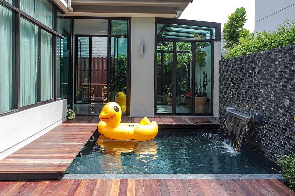 แม้จะมีพื้นที่ไม่มากนัก แต่ก็สามารถสร้างสระว่ายน้ำเล็กๆ ไว้เป็นมุมพักผ่อนของครอบครัวได้ไม่ยาก เพียงแค่จัดวางโซนสระน้ำขนาดเล็กในบริเวณที่ต้องการ ตกแต่งพื้นที่รอบสระด้วยการทำระเบียงไม้ทางเดินที่สามารถใช้เป็นมุมนั่งเล่นพักผ่อนระหว่างวัน อาจเพิ่มความรื่นรมย์ยิ่งขึ้นด้วยการติดตั้งม่านน้ำตกบริเวณกำแพงของบ้าน นอกจากจะช่วยเพิ่มความเย็นสบายให้กับพื้นที่พักผ่อนของบ้านได้ดีแล้ว ยังสามารถเพิ่มความรื่นรมย์ให้กับวันพักผ่อนได้มากกว่าการจัดสวนเพียงอย่างเดียว