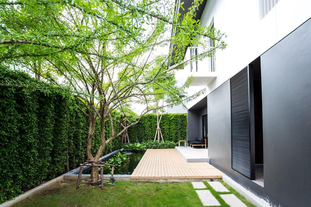 บ้านที่มีพื้นที่หลังบ้านสำหรับจัดสวนปลูกต้นไม้ อาจเพิ่มความสุนทรีย์ให้พื้นที่ในบริเวณนี้เหมาะสำหรับการพักผ่อนมากยิ่งขึ้น ด้วยการทำบ่อน้ำขนาดเล็กขนานไปตามแนวยาวของกำแพงหลังบ้าน พร้อมเสริมมุมพักผ่อนสำหรับนั่งเล่นด้วยการทำมุมระเบียงไม้ที่เชื่อมต่อกับตัวบ้าน ที่สำคัญอย่าลืมเติมความสดชื่นด้วยพื้นที่สีเขียวธรรมชาติ ลองปลูกต้นไทรเกาหลีหรือต้นแก้วตามแนวกำแพงของบ้านเพื่อทำเป็นกำแพงต้นไม้ ก็สามารถเพิ่มความร่มรื่นให้กับสเปซนั่งเล่นหลังบ้านได้อย่างง่ายดาย โดยไม่ต้องจัดสวนปลูกต้นไม้ขนาดใหญ่ให้เปลืองพื้นที่ใช้งาน