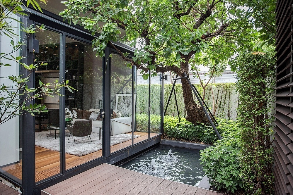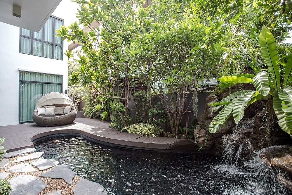 เพิ่มความรื่นรมย์ให้มุมพักผ่อนหลังบ้านดูน่าตื่นตามากยิ่งขึ้น ด้วยการออกแบบสเปซหลังบ้านให้มาพร้อมบ่อน้ำขนาดเล็กๆ ที่มาพร้อมน้ำพุในตัว อาจเชื่อมต่อโซนพักผ่อนระหว่างพื้นที่ภายในบ้านและโซนด้านนอกด้วยการทำระเบียงไม้นั่งเล่นบริเวณบ่อน้ำ ตกแต่งสวนสีเขียวด้วยพืชพรรณไม้ขนาดต่างๆ ที่ให้ร่มเงาได้ดี และหากติดตั้งผนังกระจกใสบริเวณตัวบ้านก็จะช่วยนำบรรยากาศแห่งความรื่นรมย์เข้าสู่ตัวบ้านได้มากขึ้น