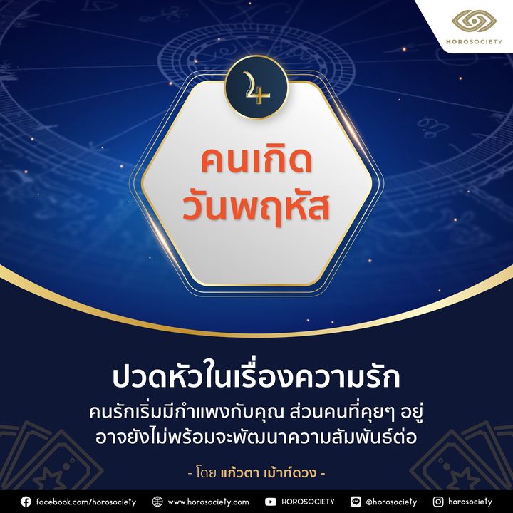 - คนเกิดวันพฤหัสบดี : ปวดหัวในเรื่องของความรัก โดยคนรักจะเริ่มมีกำแพงกับคุณ ส่วนคนที่คุย ๆ กันอยู่ อาจยังไม่พร้อมที่จะพัฒนาความสัมพันธ์ต่อ