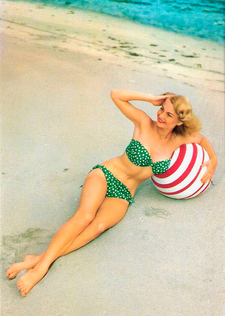 ทศวรรษ 1950s เทรนด์แฟชั่นคือ ‘เอวกิ่ว’ หญิงในฝันจะต้องมีสะโพกกลมกลึงและทรวงอกเต่งตึง ชุดว่ายน้ำสองชิ้นดูเหมือนไม่ตอบสนองหญิงใดที่ต้องการรัดเอวให้กิ่ว แต่ก็ยังมีข้อยกเว้นสำหรับบางคน อย่างมาริลีน มอนโรที่สวมชุดบิกินีถ่ายภาพในปี 1953 หรือในปีเดียวกัน บริจิตต์ บาร์โดต์ ซึ่งตอนนั้นยังไม่เป็นที่รู้จักมากนัก สวมชุดบิกินีลายหมากรุกสีชมพูไปร่วมเทศกาลภาพยนตร์เมืองคานส์