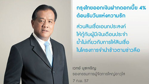 ผู้สื่อข่าวรายงานว่า นายเวทย์ นุชเจริญ รองกรรมการผู้จัดการใหญ่อาวุโส สายงานธุรกิจรายย่อยและเครือข่าย ธนาคารกรุงไทย เปิดเผยถึงกรณีที่มีข่าวลือที่แพร่กระจายอยู่ในโซเชียลมีเดียว่า ธนาคารกรุงไทยได้อนุมัติเงินกู้อเนกประสงค์ในโครงการจำนำข้าวนั้น ธนาคารขอยืนยันว่า ข่าวดังกล่าวไม่เป็นความจริง สินเชื่ออเนกประสงค์เป็นสินเชื่อบุคคล ที่ธนาคารให้บริการมากับกลุ่มข้าราชการ พนักงานรัฐวิสาหกิจ และพนักงานบริษัทเอกชน ที่มีรายได้เงินเดือนประจำมาอย่างต่อเนื่องเป็นระยะเวลากว่า 10 ปี สำหรับเสริมสภาพคล่องและใช้จ่ายเพื่อคุณภาพชีวิตที่ดี