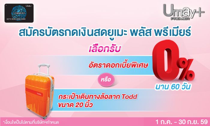 สมัครบัตรกดเงินสดยูเมะ พลัส พรีเมียร์ และได้รับการอนุมัติ ตั้งแต่วันนี้ - 30 กันยายน 2559 เพียงทำรายการเบิกถอนเงินสดภายใน 30 วัน หลังได้รับอนุมัติ เลือกรับสิทธิพิเศษตามสไตล์คุณ (1ท่าน/1โปรโมชั่น) *อัตราดอกเบี้ยพิเศษ 0% นาน 60 วัน สำหรับยอดเบิกถอนเงินสดทุกรายการในวันแรกเท่านั้น *กระเป๋าเดินทางล้อลาก Todd ขนาด 20 นิ้ว มูลค่า 4,450 บาท เพียงมียอดเบิกถอนเงินสดในวันแรกตั้งแต่ 15,000 บาท ขึ้นไป และมียอดเงินต้นคงค้างไม่ต่ำกว่า 10,000 บาท ทุกวันตลอดระยะเวลาอย่างน้อย 30 วัน