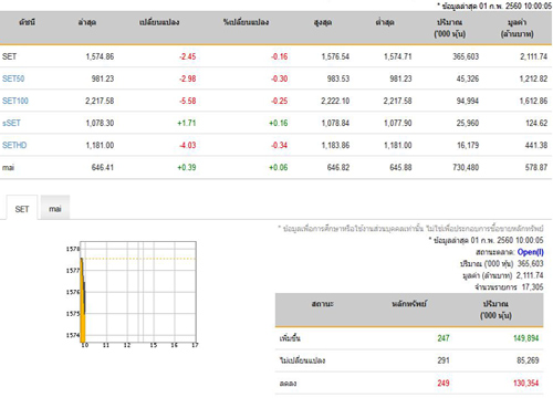 บรรยากาศการลงทุนในตลาดหุ้นไทยเช้าวันนี้ (1 ก.พ.) เปิดทำการเมื่อเวลา 10.00 น. ดัชนีปรับตัวลดลง 2.45 จุด
