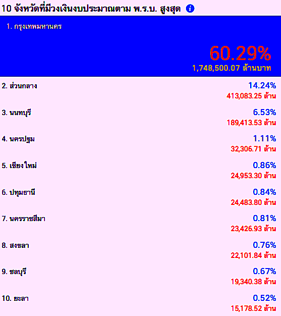 10 อันดับจังหวัดได้งบประมาณสูงสุด-กทม.กวาดไป 60.29% เท่ากับ 1.74 ล้านล้านบาท