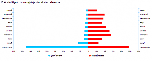 แต่หากตัดกรุงเทพมหานครออก และพิจารณาเฉพาะในจังหวัดต่าง ๆ จะเห็นว่านนทบุรี มีมูลค่าโครงการมากที่สุด แต่หากพิจารณาเป็นจำนวนโครงการ จะเห็นว่าหัวเมืองใหญ่มีโครงการมากที่สุด คือ เชียงใหม่ ขอนแก่น อุบลราชธานี นครศรีธรรมราช เป็นต้น