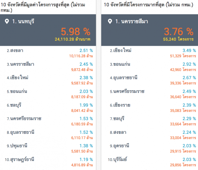 เมื่อพิจารณาจากงบประมาณจัดซื้อจัดจ้าง กรุงเทพมหานครนคร ได้รับการจัดสรรงบประมาณมากที่สุด รองลงมาคือ นนทบุรี สงขลา นครราชสีมา เชียงใหม่ ขอนแก่น ชลบุรี นครศรีธรรมราช อุบลราชธานี และปทุมธานี