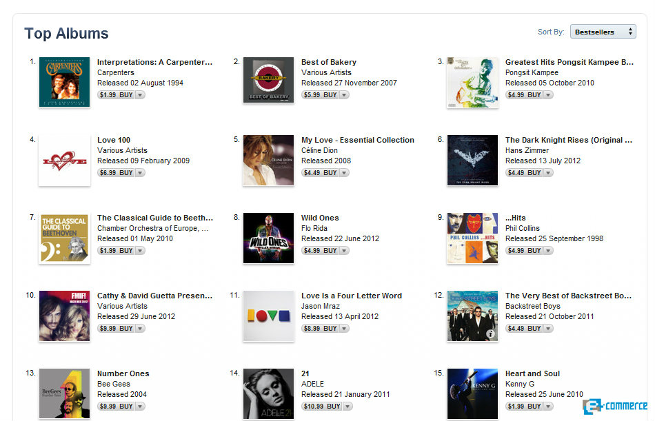 อย่างรวมเพลงฮิต Carpenter 21 เพลง ไปจนถึงอัลบั้มใหม่ๆ อย่าง Jason Mraz ชุดล่าสุดก็ขายในราคา $8.99 ก็ถือว่าถูกกว่าแผ่น CD พอสมควร แถมต่อมายังลดราคาลงเหลือ $5.99 เท่านั้น