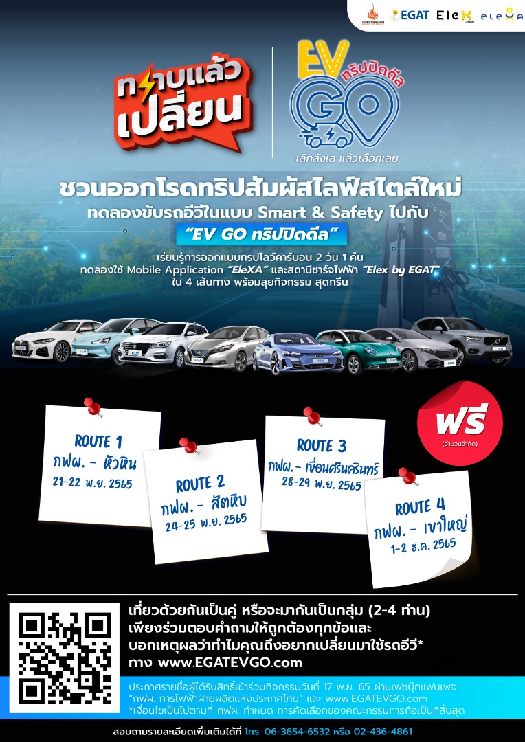 หากเติมที่สถานีชาร์จไฟฟ้าราคา 1.50-1.60 บาทต่อกิโล เมื่อได้ลองเองแล้วจะรู้ เราจึงได้คิกออฟกิจกรรม “EV GO ทริปปิดดีล” ภายใต้แคมเปญ “ทราบแล้วเปลี่ยน” ของกระทรวงพลังงาน เพื่อชวนคนไทยที่สนใจได้สัมผัสประสบการณ์ และคุ้นเคยกับไลฟ์สไตล์ใหม่ เรียนรู้การออกแบบเส้นทาง ทดลองขับขี่รถอีวีอย่างชาญฉลาด และปลอดภัย รวมถึงได้ทดลองใช้ Mobile Application EleXA และสถานีชาร์จไฟฟ้า EleX by EGAT ใน 4 เส้นทาง ได้แก่ หัวหิน สัตหีบ เขื่อนศรีนครินทร์ และเขาใหญ่