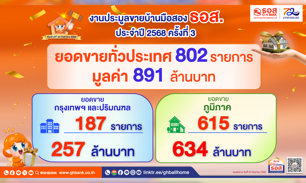 ธอส. ช่วยคนไทยมีบ้าน ลูกค้าประมูลทรัพย์มือสองทั่วประเทศได้กว่า 800 รายการ มูลค่ารวม 891 ล้านบาท