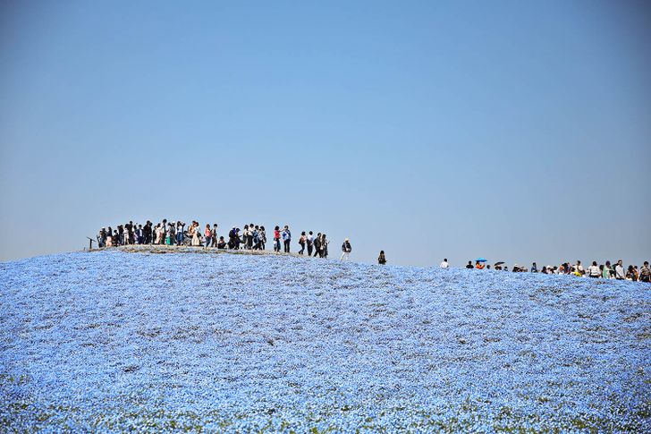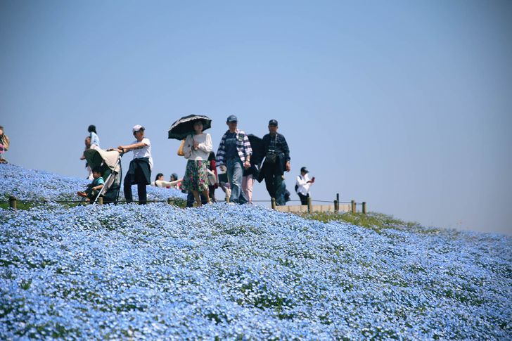 สวนแห่งแรกที่เราแนะนำนี้ น่าจะเป็นที่ยอดนิยมที่สุดสำหรับการชมดอกเนโมฟีลา ด้วยการอยู่ในเมือง อิบารากิ (Ibaraki) ที่ไม่ไกลจากโตเกียว ทำให้คนเป็นพันๆ มาเยือนสวนแห่งนี้เพื่อชมดอกไม้ อันที่จริง Hitachi Seaside Park แห่งนี้ มีดอกไม้ประจำฤดูกาลสลับสับเปลี่ยนมาให้ชมอยู่เสมอ แต่หากต้องการมาชมดอกเนโมฟีลา ต้องแวะมาช่วงปลายเดือนเมษายนถึงต้นพฤษภาคม หมู่มวลดอกไม้สีฟ้าที่แกว่งไกลบนเนินเขาดูแล้วงดงามมาก ทุ่งดอกไม้รูปทรงระฆังเหล่านี้ มองใกล้ๆ ก็น่ารัก มองไกลๆ ก็ดูราวกับภาพวาดเลยทีเดียว ทำให้ทุกปีผู้มีเยือนต่างก็มายังสวนแห่งนี้จนกลายเป็นเหมือนงานประจำปีไปแล้ว
