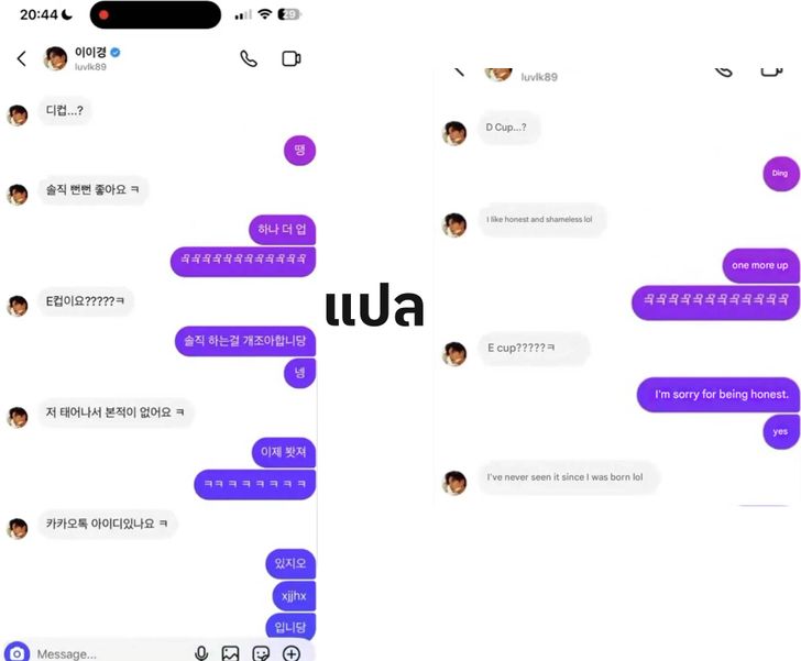 ว้าย! "อีอีคยอง" ดาวร้ายหน้าหล่อ ถูกสาวทรงโต เปิดแชตแฉ "ขอดูคัพ E เกิดมาไม่เคยเห็น"