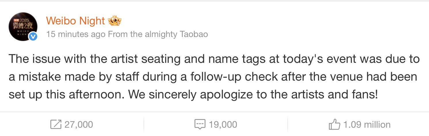 กลายเป็นประเด็นร้อนแรงที่สุดในงานประกาศรางวัลประจำปีของวงการบันเทิงจีนอย่าง Weibo Night 2025 ณ สนามกีฬาแห่งชาติปักกิ่ง เมื่อเกิดความสับสนเรื่องการจัดผังที่นั่งของเหล่าซูเปอร์สตาร์แถวหน้า จนกลายเป็นประเด็นบานปลายในโลกออนไลน์