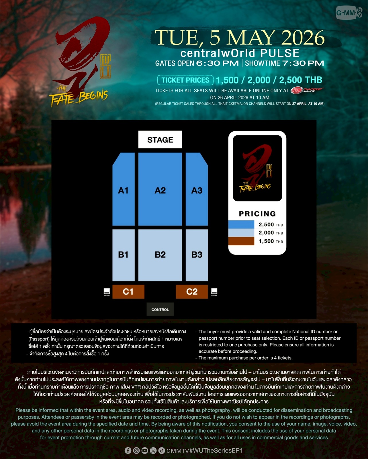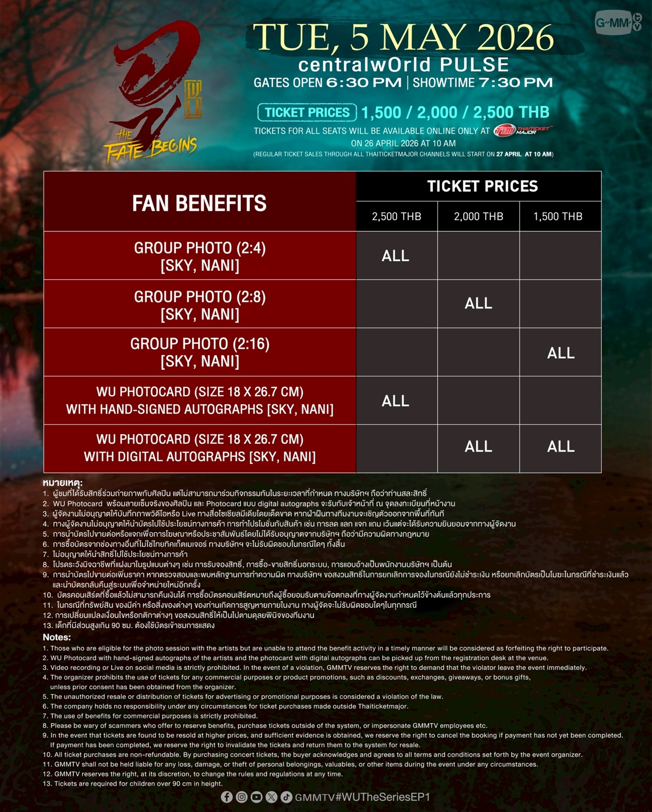 สำหรับผู้ที่สนใจสามารถจองบัตรเข้าร่วมงาน “WU : The Fate Begins” เปิดจำหน่ายบัตรบนช่องทาง Online วันอาทิตย์ที่ 26 เมษายน 2569 เริ่มเวลา 10:00 น. เป็นต้นไป ที่ www.thaiticketmajor.com เท่านั้น บัตรราคา 2,500 / 2,000 / 1,500 บาท และเปิดจำหน่ายทุกช่องทางตามปกติ วันจันทร์ที่ 27 เมษายน 2569 เริ่มเวลา 10:00 น. เป็นต้นไป ทางไทยทิคเก็ตเมเจอร์ทุกสาขา, www.thaiticketmajor.com และ Call center โทร 0-2262-3456 หรือสามารถติดตามรายละเอียดเพิ่มเติมได้ที่ Facebook : www.facebook.com/gmmtvofficial และ Instagram & X & TikTok & YouTube & Weibo : GMMTV