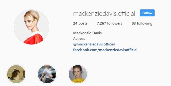 ผิดกับนักแสดงฮอลลีวูดทั่วไปที่เรารู้จัก หลาย ๆ คนมักจะมีแฟน ๆ ที่ชื่นชอบในผลงานต่างก็อยากติดตามความเคลื่อนไหวของนักแสดงที่ตัวเองชื่นชอบกันเป็นหลักล้าน แต่อินสตาแกรมของแม็กเคนซี เดวิส มีแฟน ๆ ติดตามเธอเพียงแค่ 7,523 คนเท่านั้นเอง ณ วันที่ 25 ตุลาคม 2562 หลังจากหนัง Terminator Dark Fate ออกฉายในสหรัฐฯ วันที่ 1 พฤศจิกายน น่าจะมีแฟน ๆ มาฟอลโลว์เธอมากขึ้นก็เป็นได้นะ หรืออยากจะติดตามเธอทางเฟซบุ๊กก็ได้นะ https://www.facebook.com/MackenzieDavisOfficial/ ส่วนอันนี้เป็นอินสตาแกรมที่ให้แฟนคลับติดตาม มีคนตามเยอะกว่าอีก https://www.instagram.com/mackenziedavis_official/