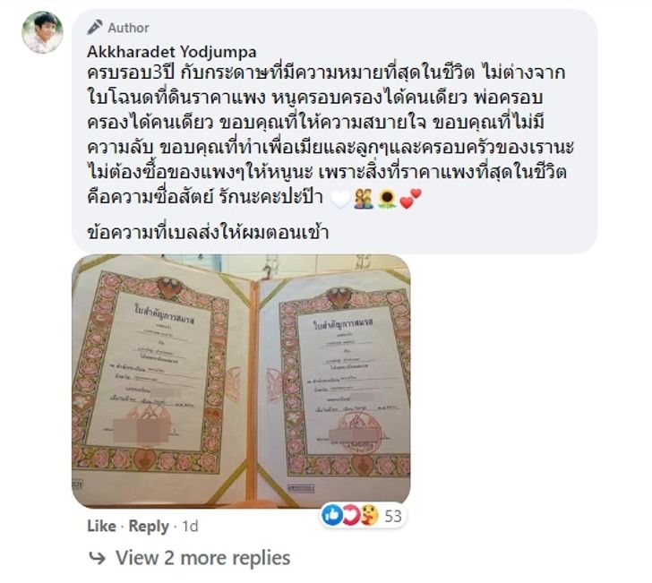 พอเขียนข้อความของตัวเองเสร็จ ก้องก็ได้มาโพสต์ข้อความที่ภรรยาส่งให้เขาในช่องคอมเมนต์ว่า "ครบรอบ 3 ปี กับกระดาษที่มีความหมายที่สุดในชีวิต ไม่ต่างจากใบโฉนดที่ดินราคาแพง หนูครอบครองได้คนเดียว พ่อครอบครองได้คนเดียว ขอบคุณที่ให้ความสบายใจ ขอบคุณที่ไม่มีความลับ ขอบคุณที่ทำเพื่อเมียและลูกๆ และครอบครัวของเรานะ ไม่ต้องซื้อของแพงๆ ให้หนูนะ เพราะสิ่งที่ราคาแพงที่สุดในชีวิตคือความซื่อสัตย์ รักนะคะปะป๊า"