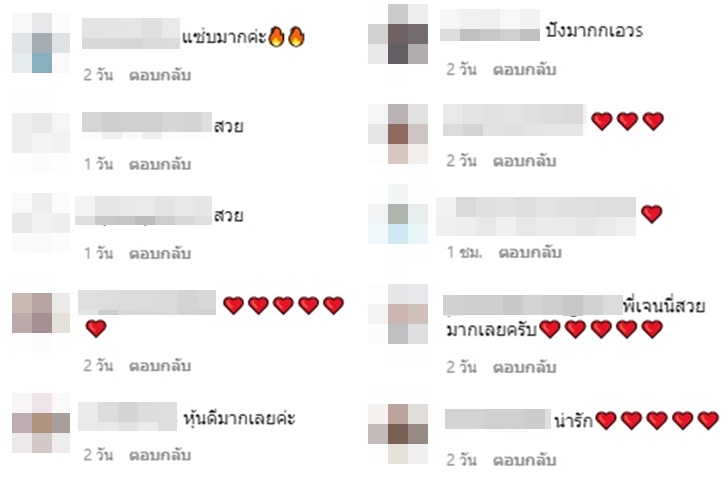 ซึ่งแฟนๆ หลายคนที่เห็นเจนนี่ในลุคออกกำลัง ก็เข้ามาคอมเมนต์พูดถึงความแซ่บรวมถึงเผยว่าพวกเขาชอบหุ่นของเจนนี่ และหลายๆ คนก็เลือกก็แสดงความรู้สึกผ่านอิโมจิหัวใจสีแดงกันอย่างท่วมท้น