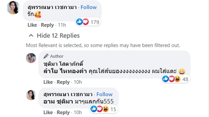 โดยหลังจากลงภาพไปไม่นาน ลำไยก็มาคอมเมนต์ว่า "รัก" ก่อนที่อามจะชี้แจงทุกคนว่าในภาพลำไยใส่รองเท้าส้นสูงในขณะที่เธอใส่รองเท้าส้นเตี้ย จนลำไยคอมเมนต์ตอบกลับว่า "มาๆ แลกกัน"
