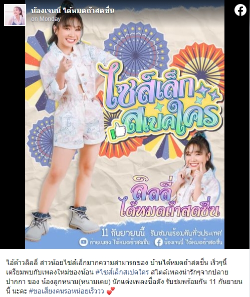 โดยเจนนี่ ได้ออกมาโพสต์ภาพลุคแรกของลิลลี่และข้อความว่า "ไอ้ต้าวลิลลี่ สาวน้อยไซส์เล็กมากความสามารถของ บ้านได้หมดถ้าสดชื่น เร็วๆนี้ เตรียมพบกับเพลงใหม่ของน้อน #ไซส์เล็กสเปคใคร สไตล์เพลงน่ารักๆจากปลายปากกา ของ น้องลูกหนาม(หนามเตย) นักแต่งเพลงชื่อดัง รับชมพร้อมกัน 11 กันยายน นี้ นะคะ #ขอเสียงคนรอหน่อยเร็ววว"