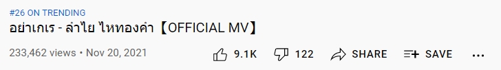 ทางด้านเอ็มวีแฟนๆ ก็ได้เห็นลำไยปรากฏตัวกับลุคที่หลากหลาย ทั้งชุดไทยไปจนถึงชุดที่มีกลิ่นอายความเป็นอินเดีย โดยล่าสุดตัวมิวสิควิดีโอได้มียอดวิวทะลุ 2 แสนครั้งไปแล้ว พร้อมติดเทรนด์มาแรง (นับยอดวิวถึงวันที่ 22 พฤศจิกายน)