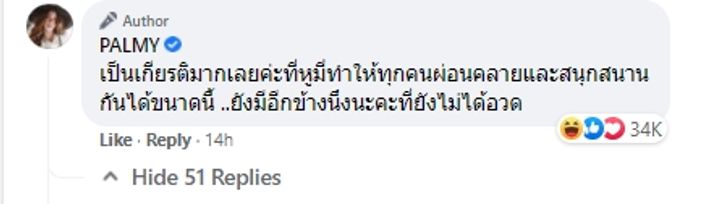 โดยหลังจากที่โพสต์ดังกล่าวเป็นที่พูดถึงอย่างมาก ปาล์มมี่ก็มาคอมเมนต์ข้อความใต้โพสต์เดิมของตัวเองว่า "เป็นเกียรติมากเลยค่ะที่หูมี่ทำให้ทุกคนผ่อนคลายและสนุกสนานกันได้ขนาดนี้ ..ยังมีอีกข้างนึงนะคะที่ยังไม่ได้อวด"