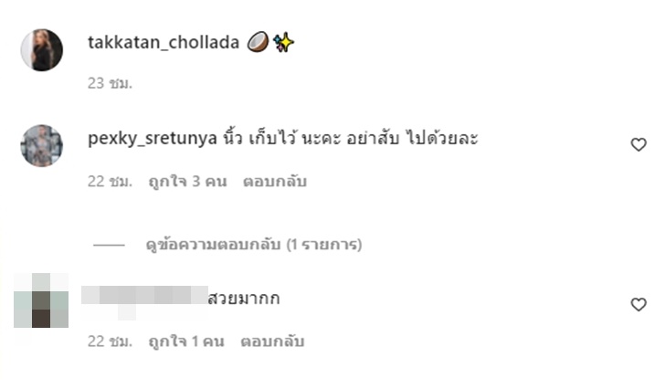 ซึ่งงานนี้เมื่อเห็นคลิป แฟนๆ ส่วนใหญ่ก็ให้ความสนใจกับความแซ่บของตั๊กแตน ขณะที่เพื่อนอย่าง เป๊กกี้ ศรีธัญญา ก็มาคอมเมนต์แซวว่า "นิ้ว เก็บไว้ นะคะ อย่าสับ ไปด้วยละ"