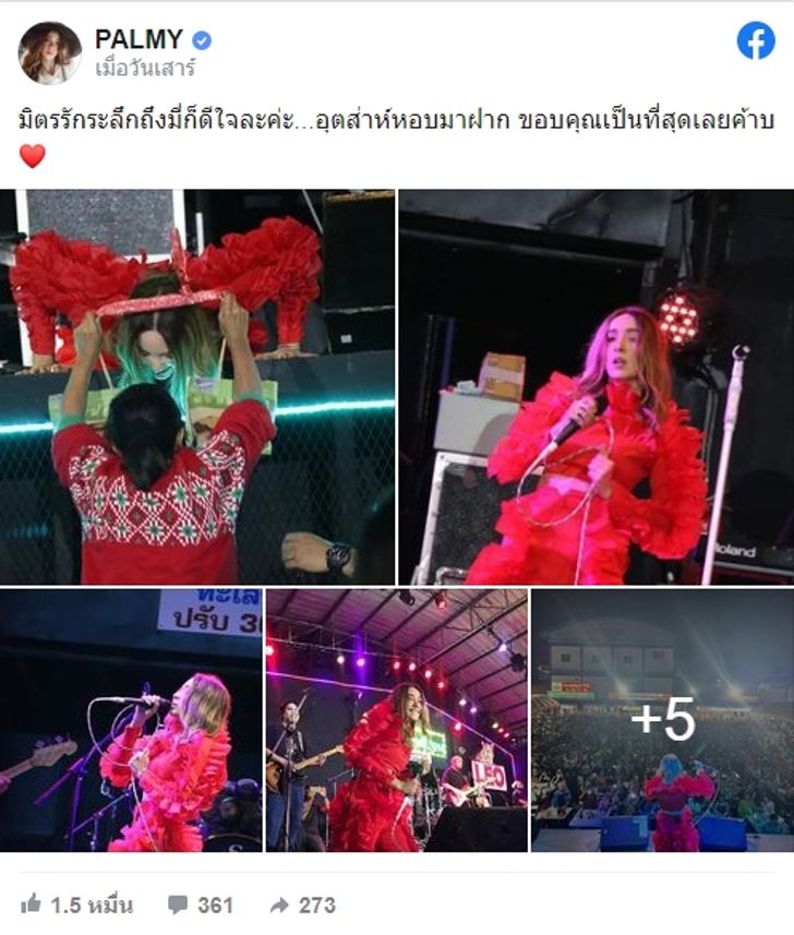 โดยในงานสัปดาห์ที่ผ่านมา ปาล์มมี่ได้เผยภาพที่เธอได้รับของฝากแฟนๆ ทั้งกุ้งเผา ตาลตโนด หมึกปิ้ง ไปจนถึงขนมหม้อแกง พร้อมแคปชั่นว่า "มิตรรักระลึกถึงมี่ก็ดีใจละค่ะ...อุตส่าห์หอบมาฝาก ขอบคุณเป็นที่สุดเลยค้าบ"