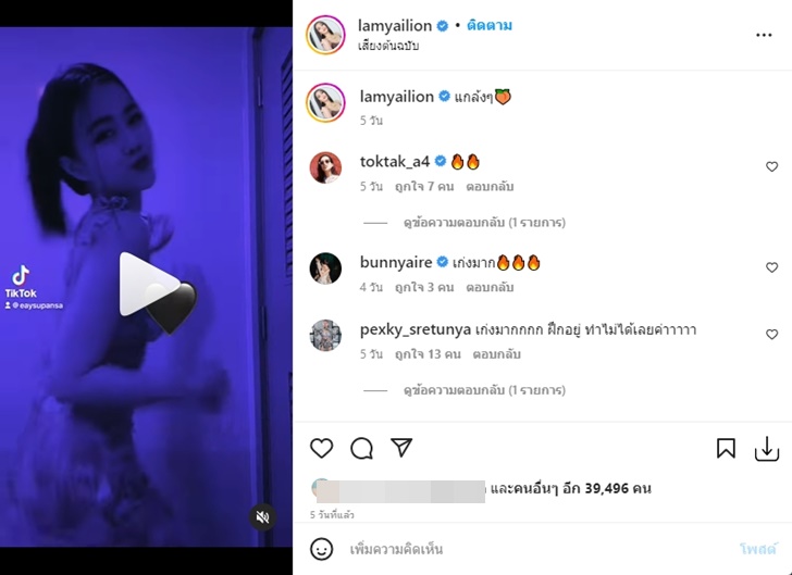 โดยล่าสุดลำไย ได้เผยคลิปการเต้นเอวเด้งลง Instagram ของตัวเอง ซึ่งมากับแคปชั่นสั้นๆ ว่า "แกล้งๆ" พร้อมอิโมจิลูกพีช จนหลายๆ คนเข้ามาคอมเมนต์ใต้โพสต์ดังกล่าวกันแบบล้นหลามทั้งเพื่อนศิลปินและแฟนๆ