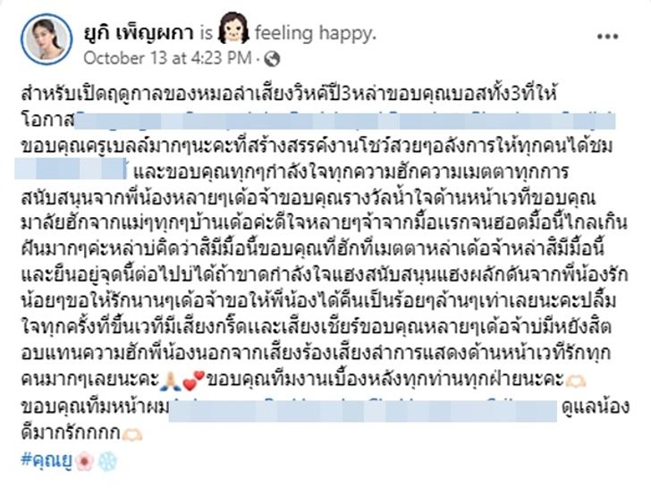 โดยโพสต์ของยูกิมาพร้อมโพสต์ว่า "สำหรับเปิดฤดูกาลของหมอลำเสียงวิหค ปี3หล่าขอบคุณบอสทั้ง3ที่ให้โอกาส ขอบคุณครูเบลล์มากๆนะคะที่สร้างสรรค์งานโชว์สวยๆ อลังการให้ทุกคนได้ชม และขอบคุณทุกๆกำลังใจทุกความฮักความเมตตาทุกการสนับสนุนจากพี่น้องหลายๆ เด้อจ้าขอบคุณรางวัลน้ำใจด้านหน้าเวทีขอบคุณมาลัยฮักจากแม่ๆ ทุกๆบ้านเด้อค่ะดีใจหลายๆ จ้าจากมื้อเเรกจนฮอดมื้อนี้ไกลเกินฝันมากๆค่ะหล่าบ่คิดว่าสิมีมื้อนี้ขอบคุณที่ฮักที่เมตตาหล่าเด้อจ้าหล่าสิมีมื้อนี้และยืนอยู่จุดนี้ต่อไปบ่ได้ถ้าขาดกำลังใจแฮงสนับสนุนแฮงผลักดันจากพี่น้องรักน้อยๆขอให้รักนานๆเด้อจ้าขอให้พี่น้องได้คืนเป็นร้อยๆล้านๆเท่าเลยนะคะปลื้มใจทุกครั้งที่ขึ้นเวทีมีเสียงกริ๊ดเเละเสียงเชียร์ขอบคุณหลายๆเด้อจ้าบ่มีหยังสิตอบแทนความฮักพี่น้องนอกจากเสียงร้องเสียงลำการแสดงด้านหน้าเวทีรักทุกคนมากๆ เลยนะคะ ขอบคุณทีมงานเบื้องหลังทุกท่านทุกฝ่ายนะคะ ขอบคุณทีมหน้าผม ดูแลน้องดีมากรักกกก"