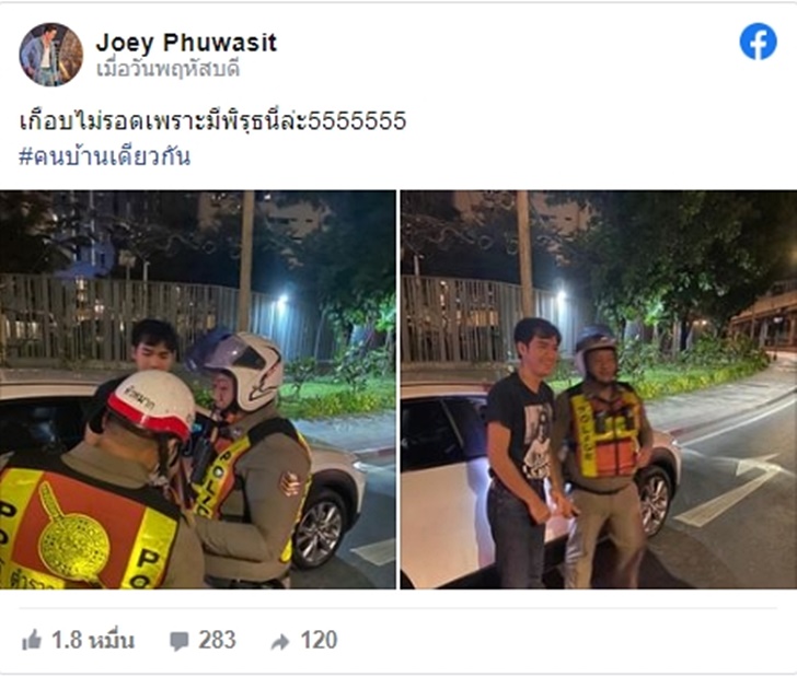 โดยโจอี้ได้ลงภาพของตัวเองขณะกำลังคุยกับเจ้าหน้าที่ตำรวจ ก่อนจบลงด้วยการถ่ายรูปคู่กับเจ้าหน้าที่พร้อมแคปชั่นว่า "เกือบไม่รอดเพราะมีพิรุธนี่ล่ะ5555555" จนแฟนๆ เข้ามาคอมเมนต์ถล่มทลายนับร้อยข้อความหลังโพสต์