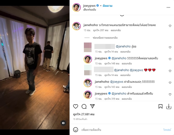 โดยเจนได้ตามมาคอมเมนต์ "วงไหนขาดแดนเซอร์สามารถติดต่อได้เลยไหมคะ" พร้อมแซวว่า "ค่าตัวเเพงเเน่ๆ 55555555" ก่อนโจอี้จะตอบกลับว่า "สำหรับเธอแล้วฟรีครับ" จนแฟนๆ เข้ามาแซวถล่มทลาย
