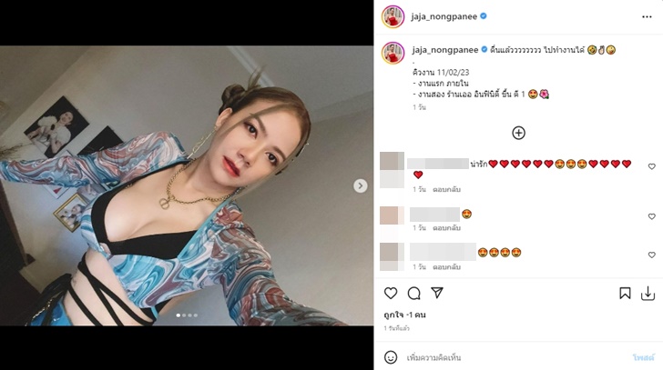 ซึ่งสุดสัปดาห์ที่ผ่านมา จ๊ะได้พิมพ์ข้อความไว้ว่า "ตื่นแล้วววววววว ไปทำงานได้" พร้อมพูดถึงคิวงาน โดยโพสต์ดังกล่าวของจ๊ะมีแฟนๆ จำนวนมากเข้ามาคอมเมนต์พูดถึงความแซ่บของเธอ นอกเหนือจากตารางงาน