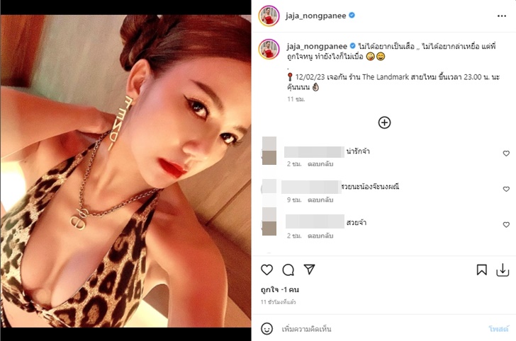 และอีกโพสต์ของจ๊ะ เธอก็มากับลุคสุดแซ่บพร้อมแคปชั่นว่า "ไม่ได้อยากเป็นเสือ ,, ไม่ได้อยากล่าเหยื่อ แต่พี่ถูกใจหนู ทำยังไงก็ไม่เบื่อ" ที่ทำให้หลายคนเข้ามาพูดถึงความแซ่บกันอย่างล้นหลาม ควบคู่กับพูดถึงตารางงานของจ๊ะ