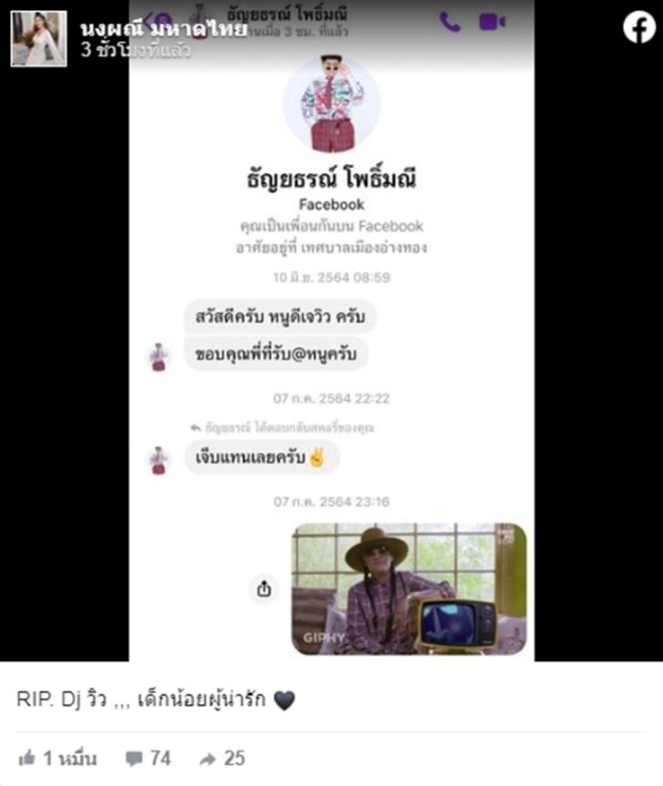 โดยจ๊ะ นงผณี ได้นำบทสนทนากับดีเจวิวมาโพสต์พร้อมแคปชั่นว่า "RIP. Dj วิว ,,, เด็กน้อยผู้น่ารัก" ซึ่งในแชทดังกล่าวเป็นข้อความที่วิวทักมาหลังรับแอด และข้อความตอบสตอรี่ด้วยความห่วงใย ซึ่งจ๊ะได้ตอบด้วยภาพ GIF