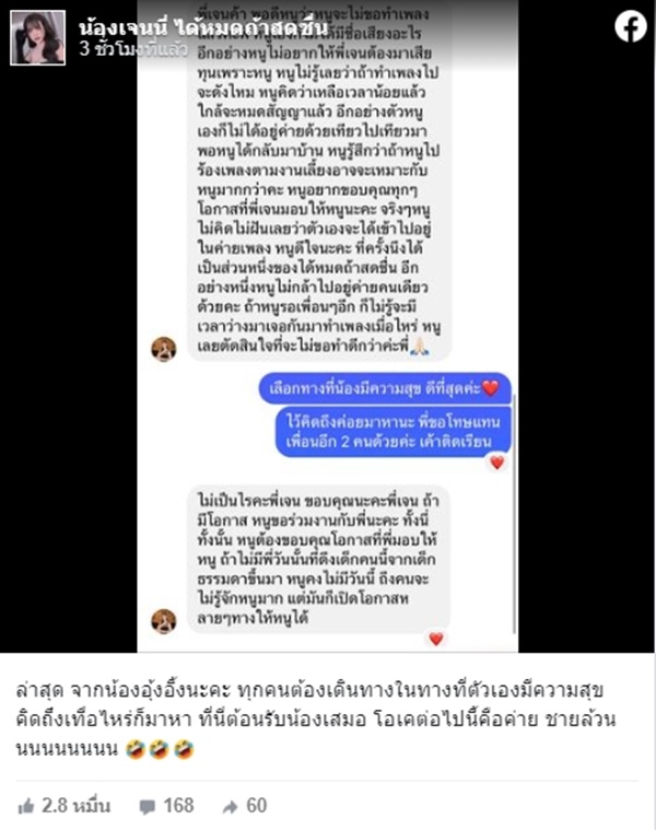 โดยเจนนี่ได้โพสต์แชทของอุ้งอิ้งที่เผยเหตุผลในการอำลาค่าย พร้อมข้อความว่า "ล่าสุด จากน้องอุ้งอิ้งนะคะ ทุกคนต้องเดินทางในทางที่ตัวเองมีความสุข คิดถึงเทื่อไหร่ก็มาหา ที่นี่ต้อนรับน้องเสมอ โอเคต่อไปนี้คือค่าย ชายล้วนนนนนนนนน"