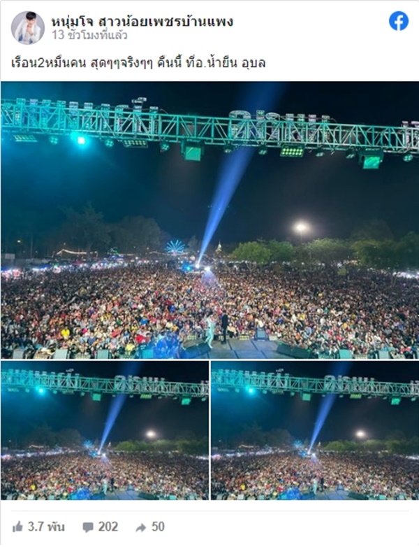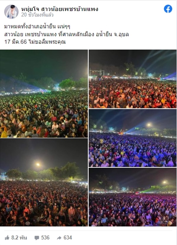 โดย โจ ยมนิลได้เผยภาพคนดูเต็มพื้นที่ศาลหลักเมือง อ น้ำยืน จ.อุบลราชธานี "มาหมดทั้งอำเภอน้ำยืน เเน่ๆๆ สาวน้อย เพชรบ้านแพง ที่ศาลหลักเมือง อ น้ำยืน จ.อุบล 17 มีค.66 ไม่ขอลืมพระคุณ" ก่อนตามด้วยแคปชั่นอีกว่า "เรือน 2 หมื่นคน สุดๆๆจริงๆๆ คืนนี้ ที่อ.น้ำยืน อุบล"