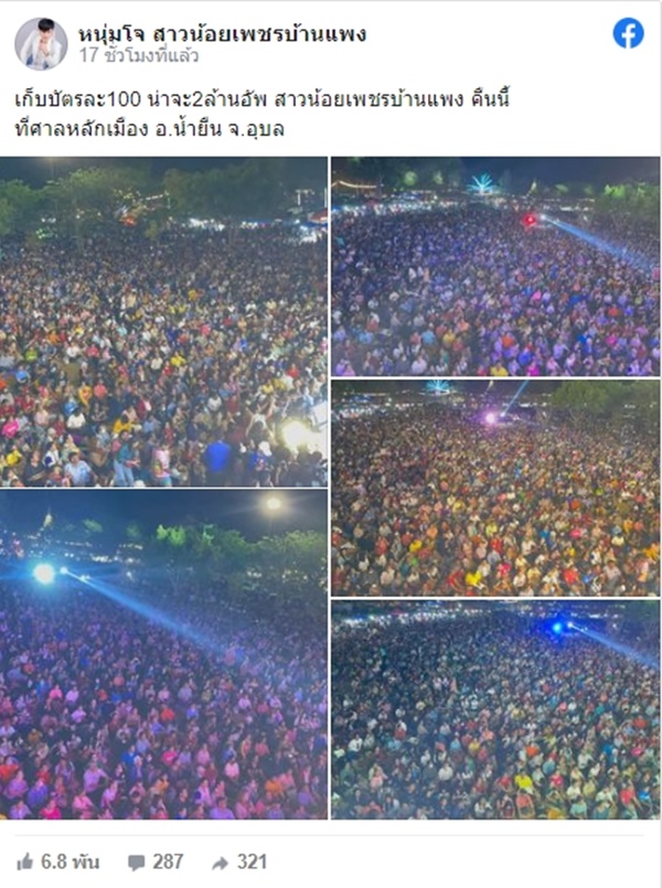 และในอีกโพสต์ที่เป็นการประเมินรายได้ โจ ยมนิล ได้เขียนว่า "เก็บบัตรละ100 น่าจะ2ล้านอัพ สาวน้อยเพชรบ้านแพง คืนนี้ ที่ศาลหลักเมือง อ.น้ำยืน จ.อุบล" จนหลายคนมาร่วมแสดงความยินดีแบบล้นหลาม