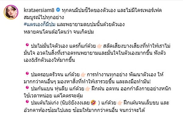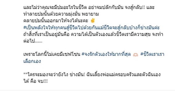 และกระแตได้ทิ้งท้ายว่า "และไม่ว่าคุณจะมีปมอะไรในชีวิต อย่าจมปลักกับมัน จงสู้กลับ!! และทำลายปมนั้นด้วยความมุ่งมั่น พยายาม คลายปมนั้นออกมาให้จงได้นะคะ #เป็นพลังใจให้ทุกคนสู้ชีวิตไปด้วยกันแม้ชีวิตจะสู้กลับบ้างก็ช่างมันค่ะ ถ้าสิ่งที่เราเป็นอยู่มันคือ ความได้เป็นตัวเองแล้วชีวิตเรามีความสุข จงทำต่อไป…… เพราะโลกนี้ไม่เคยมีเซฟโซน #จงรักตัวเองให้มากที่สุด #ชีวิตเราเราเลือกเอง **ใครจะมองจะว่ายังไง ช่างมัน! ฉันเลี้ยงพ่อแม่ครอบครัวและตัวฉันเองได้ คือ จบ!!!"