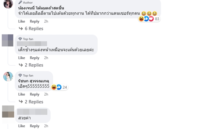 และนอกจากภาพดังกล่าว เจนนี่ยังเขียนอีกว่า "จำได้เลยลิลลี่ตามไปเต้นด้วยทุกงาน ได้ทิปมากกว่าแดนเซอร์ทุกคน" จนตัวของลิลลี่ก็มาคอมเมนต์ต่อด้วยว่า "เอิดๆ555555555"
