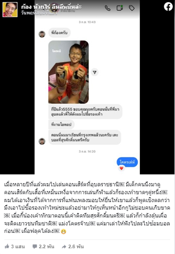 โดยก้อง ได้โพสต์เรื่องราวพร้อมแชทจากเด็กคนหนึ่งเล่าว่า "เมื่อหลายปีที่แล้วผมไปเล่นคอนเสิร์ตที่อุบลราชธานี มีเด็กคนนึงมาดูคอนเสิร์ตกับเสื้อที่เหม็นเหงื่อจากการเล่นกีฬาแล้วก็รองเท้าขาดๆ คู่หนึ่ง ผมได้เอาเงินที่ได้จากการที่แฟนเพลงมอบให้ยื่นให้เขาแล้วก็พูดเชิงตลกว่า มึงเอาไปซื้อรองเท้าใหม่ซะแล้วอย่ามาให้กูเห็นหน้าอีกกูไม่ชอบคนเกิบขาด เมื่อกี้น้องเค้าทักมาตอนนี้เค้าติดทีมสุรศักดิ์มนตรี แล้วก็กำลังลุ้นเผื่อจะติดเยาวชนทีมชาติ แม่งโคตรจ๊าบ แค่มาเล่าให้ฟังไปละไปซ้อมบอลก่อน เผื่อฟลุคได้ลง"