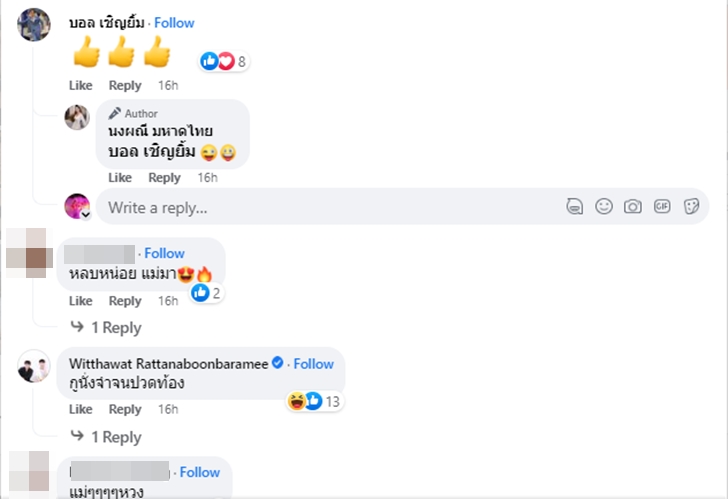 นอกจากแฟนๆ จะเข้ามาคอมเมนต์แซวกันสนุกสนานแล้ว ในโพสต์ดังกล่าวก็มี บอล เชิญยิ้ม (ชัชชัย จำเนียรกุล) รุ่นพี่ของจ๊ะ และ เอม-วิทวัส รัตนบุญบารมี เพื่อนมาคอมเมนต์ด้วย