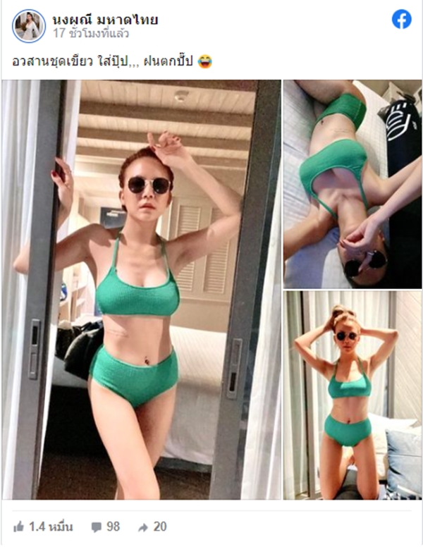 โดยจ๊ะนงผณี ได้ลงภาพตัวเองขณะใส่ชุดแซ่บสีแดงพร้อมแคปชั่นว่า "อวสานชุดเขียว ใส่ปุ๊ป,,, ฝนตกปั๊ป" จนแฟนๆ เข้ามาคอมเมนต์ในโพสต์ดังกล่าวกันอย่างล้นหลามทันที หลังรู้ว่าเกิดอะไรขึ้นหลังจ๊ะได้เตรียมตัวชุดว่ายน้ำมาเป็นอย่างดี