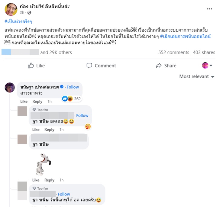 โดย ก้อง ห้วยไร่ ได้โพสต์ว่า "#เป็นห่วงจริงๆ แฟนเพลงที่ทักข้อความส่วนตัวผมมามากที่สุดคือขอความช่วยเหลือ เรื่องเป็นหนี้นอกระบบจากการเล่นเว็บพนันออนไลน์ หยุดเถอะครับห้ามใจตัวเองให้ได้ ในโลกใบนี้ไม่มีอะไรได้มาง่ายๆ #เลิกเล่นการพนันออนไลน์ ก่อนที่คุณจะไม่เหลืออะไรแม้แต่ลมหายใจของตัวเอง"