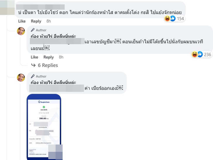 และหลังจากนั้นก้องก็ได้ตอบต่อว่า "เอาเลขบัญชีมา ตอนเย็นถ้าไม่มีโต๊ะขึ้นไปนั่งกับผมบนเวทีเลยนะ" ก่อนจะโอนเงินและส่งสลิปให้พร้อมกับข้อความว่า "ค่า เบียร์ออกเอง"