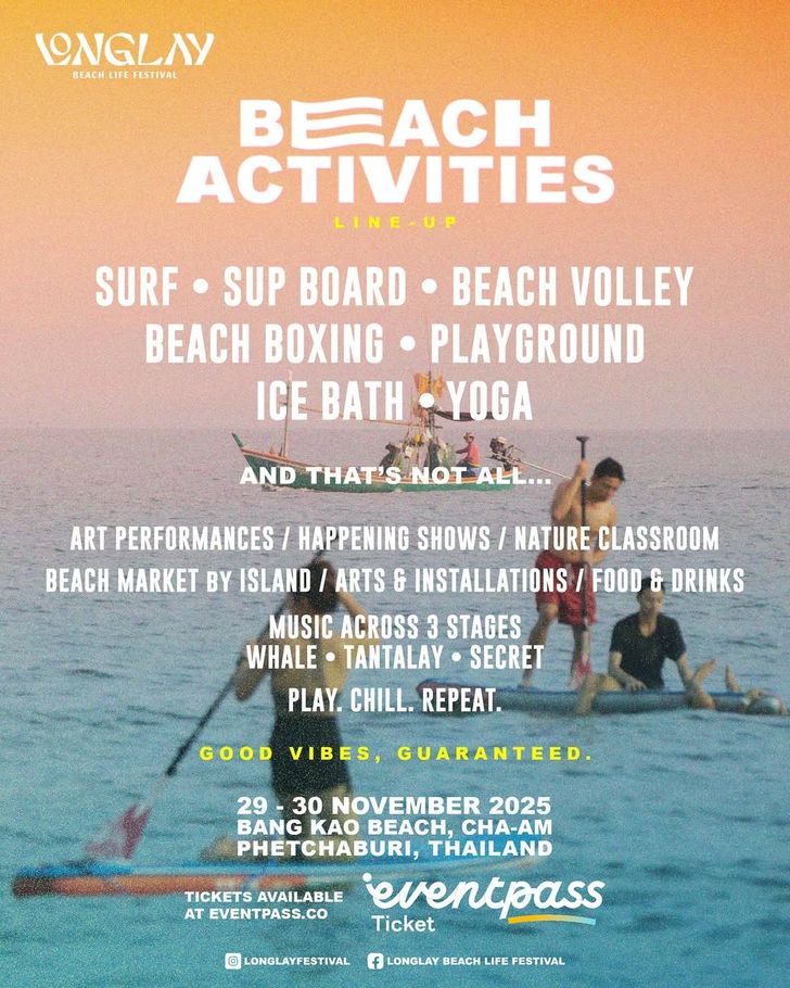 นอกเหนือจากดนตรี Longlay ยังเป็นพื้นที่ของการใช้ชีวิตริมทะเลอย่างแท้จริง เพราะนี่ไม่ใช่แค่คอนเสิร์ต แต่คือคอมมูนิตี้ที่รวมคนแฟชั่น คนครีเอทีฟ และคนรักบีชไลฟ์ให้มาพบกันบนผืนทรายเดียว ทั้ง Surf, SUP Board, Beach Volley, Muay Talay, Sand Art, Ice Bath, Yoga, Art Performances, Beach Market by ISLAND, Arts & Installations ไปจนถึง Food & Drinks ที่รอให้คุณได้สัมผัสและใช้เวลาร่วมกัน