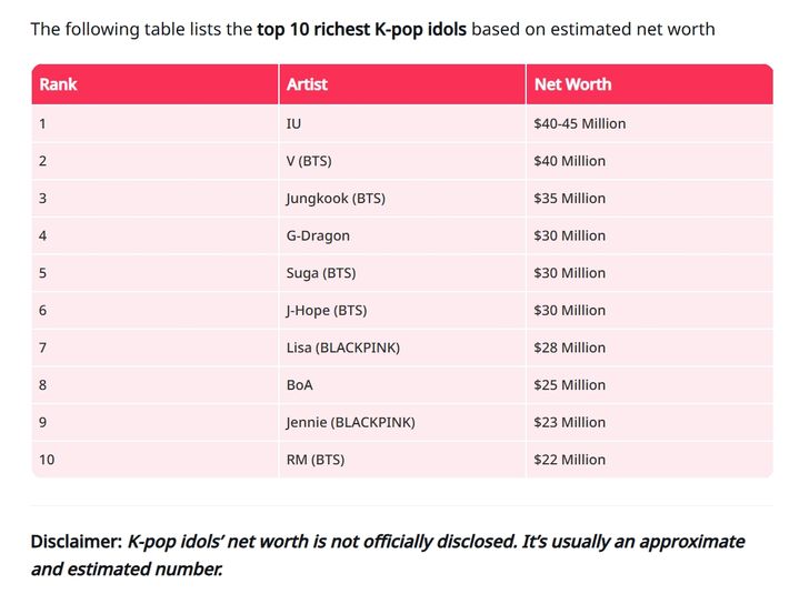ไอยู, คิม แทฮยอง (V) และ จองกุก (Jungkook) ครองตำแหน่งสูงสุด ด้วยมูลค่าทรัพย์สินรวมกันเกิน 100 ล้านเหรียญ ซึ่งสะท้อนให้เห็นว่าความสำเร็จในวงการ K-Pop ไม่ได้วัดจากความนิยมเพียงอย่างเดียว แต่ยังมาจากความสามารถในการบริหารรายได้และขยายโอกาสทางธุรกิจ