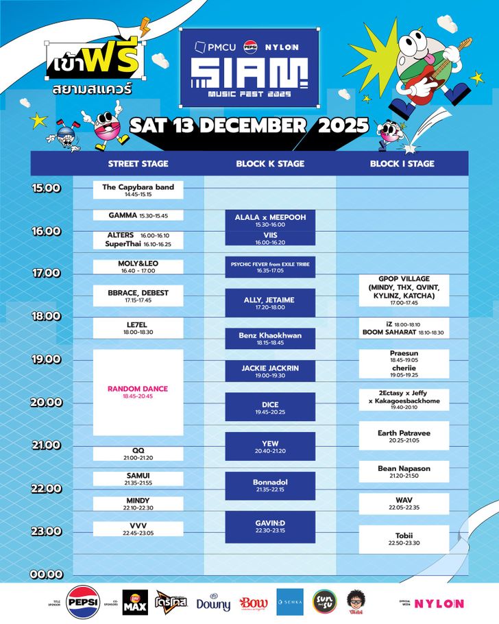 โดยในงาน Siam Music Fest 2025 จะแบ่งโซนการจัดงานออกเป็น 3 โซนหลัก ได้แก่ Street Stage, Block K Stage และ Block I Stage ซึ่งทั้งสามเวทีก็จะมีโชว์ของเหล่าศิลปินรันยาวตลอดทั้งคืน โดยมีตารางขึ้นโชว์ดังนี้
