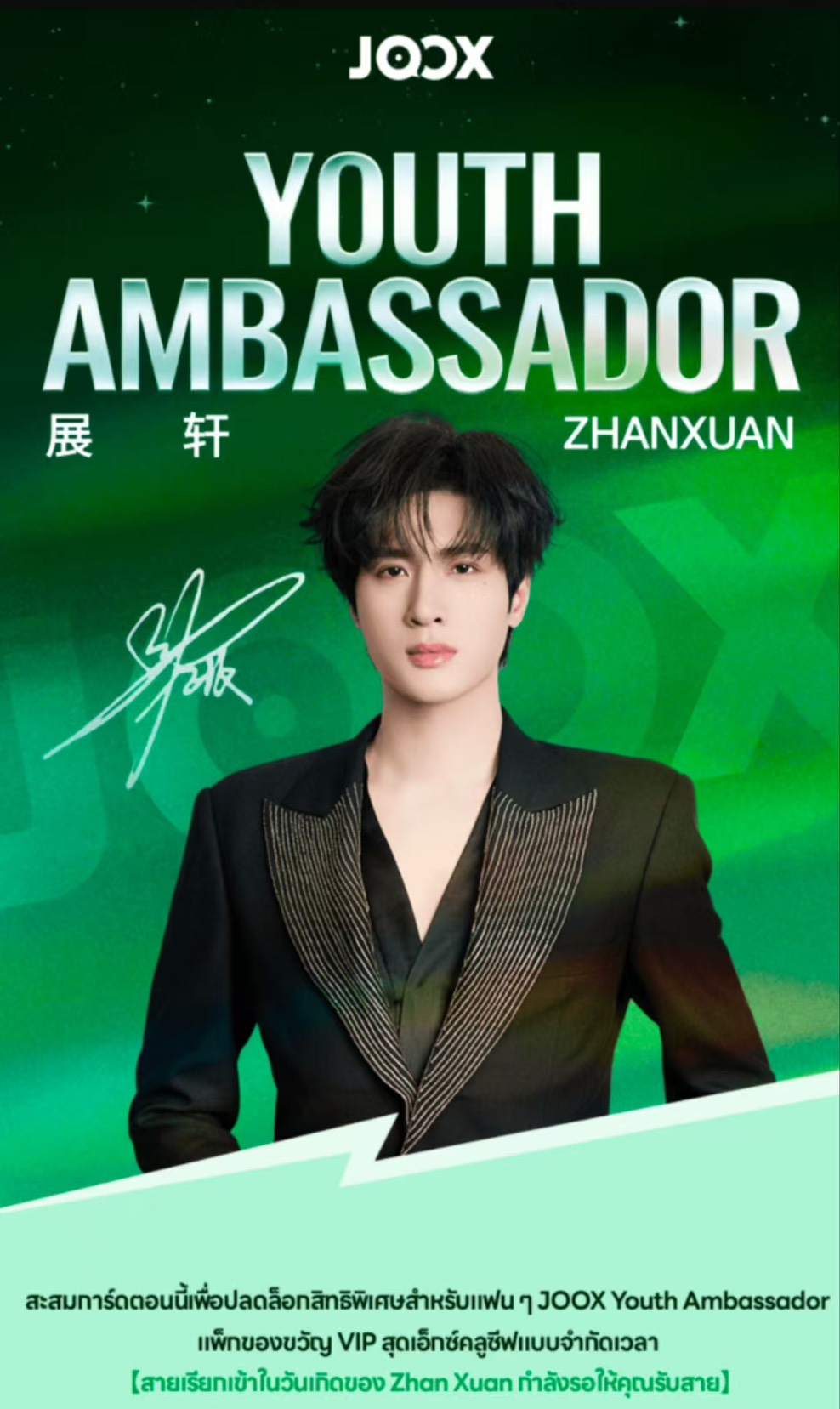 JOOX ประกาศแต่งตั้ง Zhan Xuan ในฐานะ JOOX Youth Ambassador อย่างเป็นทางการ ด้วยความเชื่อร่วมกันว่าดนตรีคือเสียงที่ทรงพลังที่สุดของคนรุ่นใหม่ การร่วมมือครั้งนี้นับว่าเป็นการเปิดบทใหม่ของ JOOX ที่มุ่งสร้างพื้นที่ให้เสียงของคนรุ่นใหม่ดังขึ้นกว่าเดิม